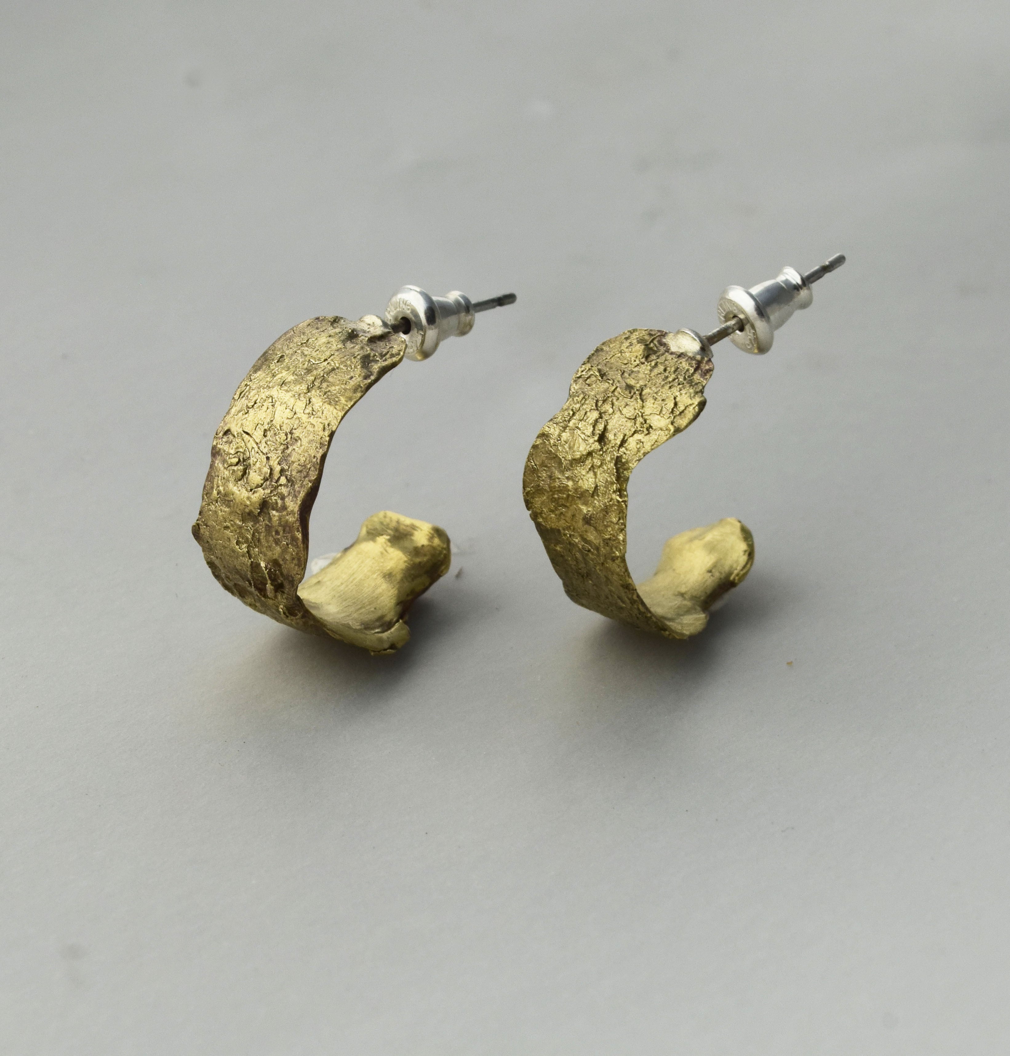 春になると、パッと力強く咲く山桜 周りは明かりが灯ったように明るくなり 遠くから山を眺めても、そこに山桜があるのが一目で分かります。 人も、山桜のようにどこにいても堂々と自分らしくあれたらと思い 樹皮のテクスチャーを移しとりました。 木に包まれるような安心感を味わえたら。。 一点一点手作りしています type:S Brass 真鍮 ポスト金具 シルバー925